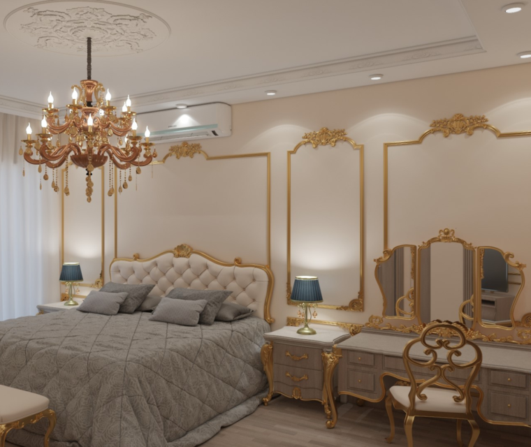 The interior design of this private palace blends opulence with timeless elegance, featuring custom-crafted details in every room. The grand entrance hall, with its sweeping marble staircase and intricate moldings, sets the tone for the luxurious interiors. The formal living room and banquet hall are adorned with high ceilings, custom chandeliers, and fine finishes, providing a majestic atmosphere for entertaining.